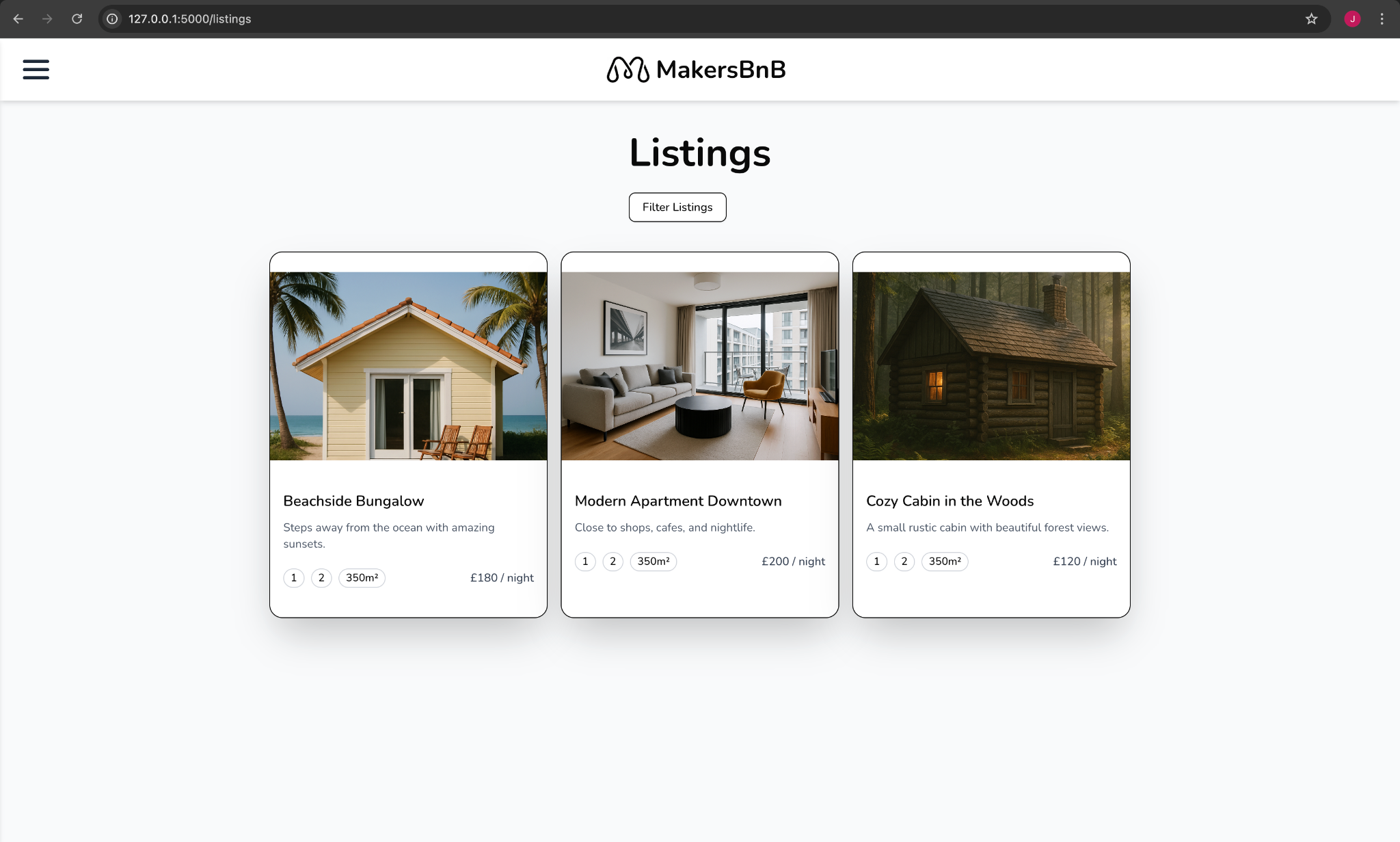 Final project at Makers: an Airbnb style booking platform with authentication, listings, and booking flows. Built test first in a cross functional team.