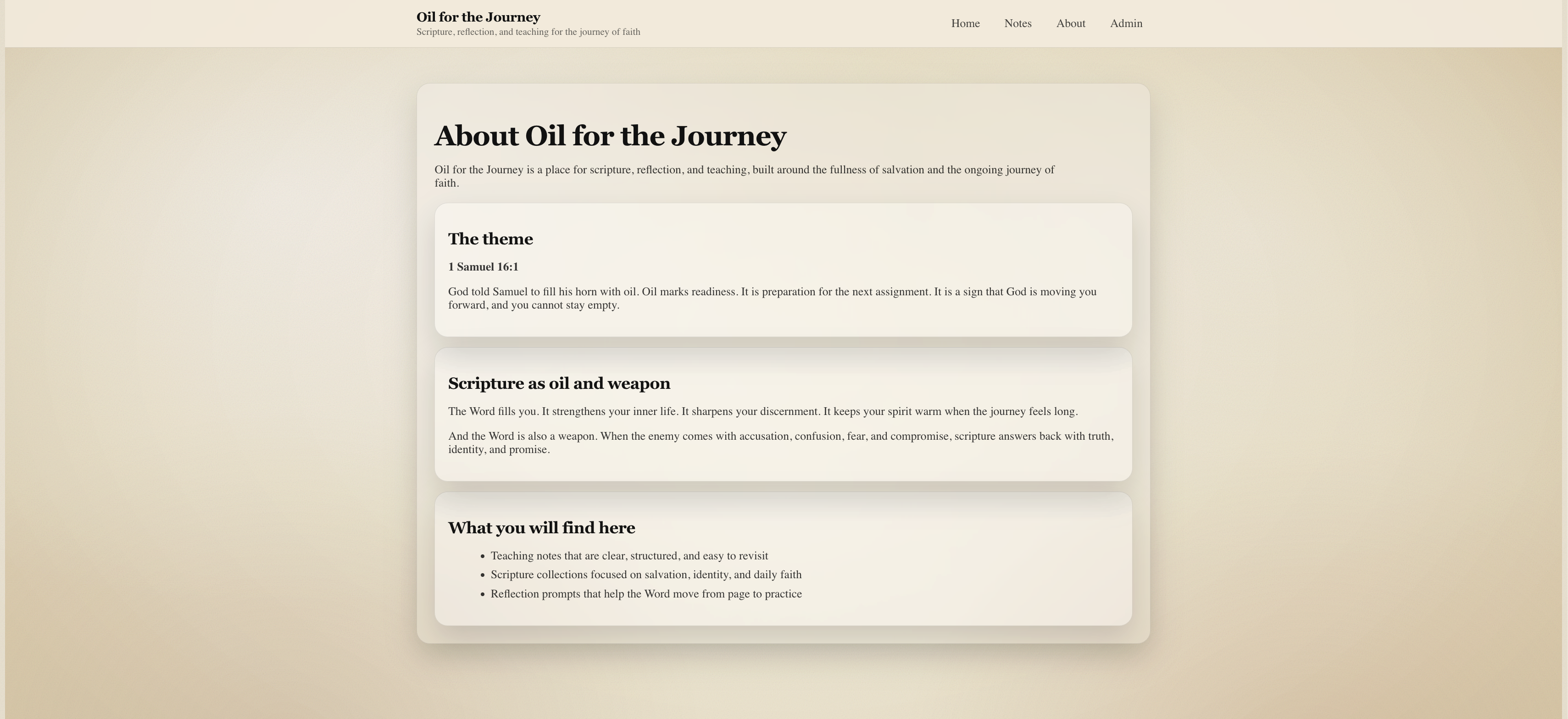 Oil for the Journey solves a real product gap: most writing tools optimise for speed and attention, not reflective long-form work. I built this to support calm drafting, intentional publishing, and a cleaner reading experience.