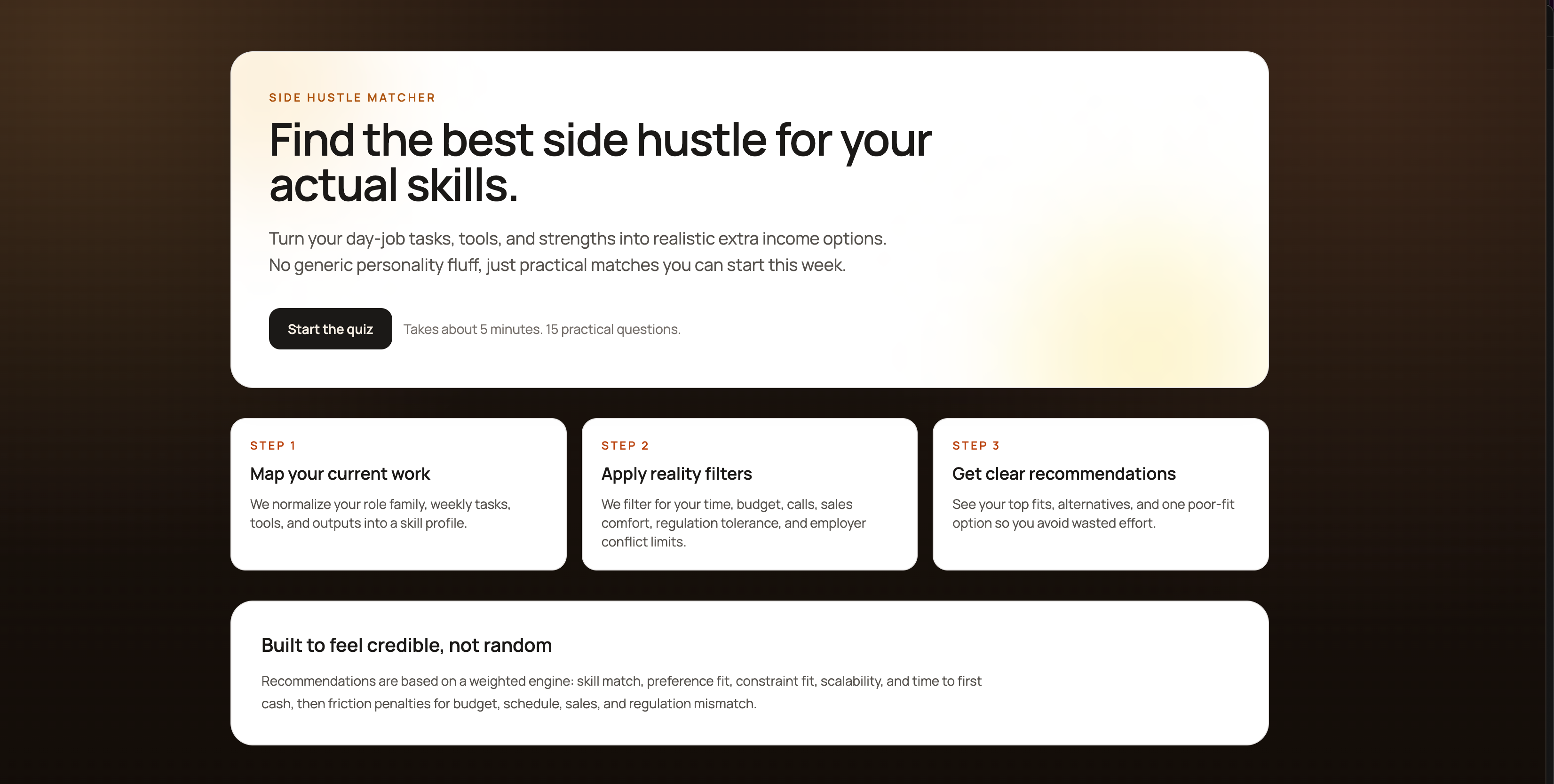 Built and shipped a practical quiz product that maps role family, tasks, tools, and constraints into realistic side-hustle recommendations with clear commercial next steps.