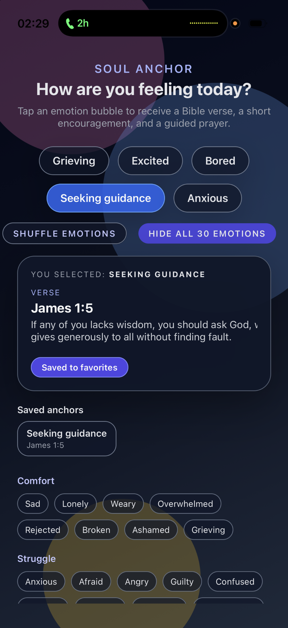 I designed and implemented an emotion-based mobile experience with structured content, saved anchors, and calming interactions.